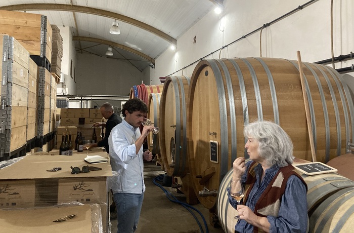 Toutes les vignes du domaine sont cultivées en gobelet (pour la quête de la fraîcheur et minéralité). Muriel nous explique la difficulté à cultiver le cépage nielluciu : « Au sein d’une même grappe de raisin, certains grains peuvent être à 8 degrés potentiels d’alcool et d’autres à 14 ! ». Pour cette raison , Muriel trie beaucoup : 40% sur ce cépage en 2025. Le schiacarellu – «le pinot noir du sud» – lui est plus facile.
