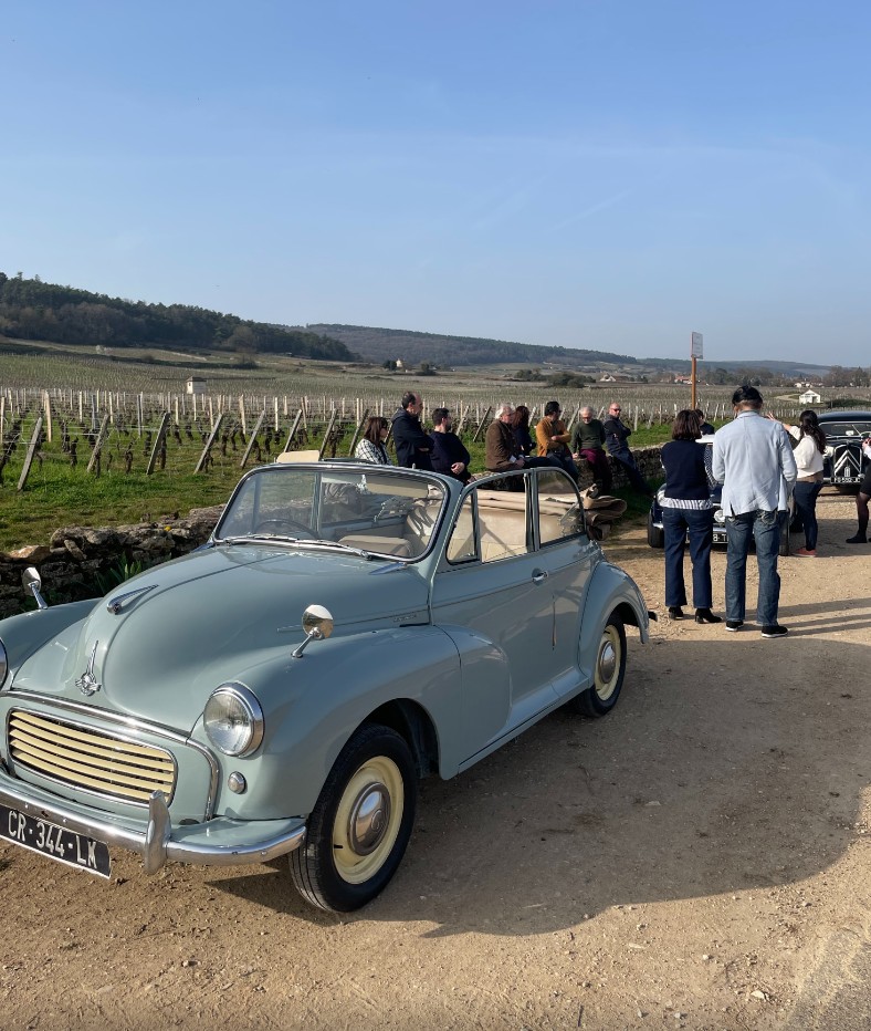 Les heureux clients VIP ont ensuite eu la chance de partir avec Angélique, Laura, Caroline et Laure pour un tour dans le vignoble en voitures anciennes. Laure, notre guide locale (en réalité cheffe de projet marketing) a présenté le vignoble bourguignon, son histoire et fait un focus sur certaines parcelles emblématiques.